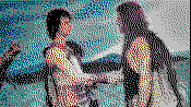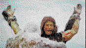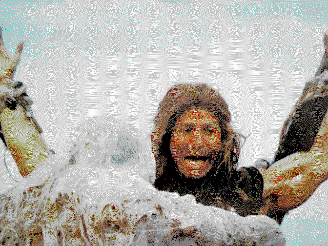 Hero Mazx (GEORGE RIVERO) captured by cave dwellers is casted from the mountain of Ocron, Goddess of the Underworld, to the icy waters below. |